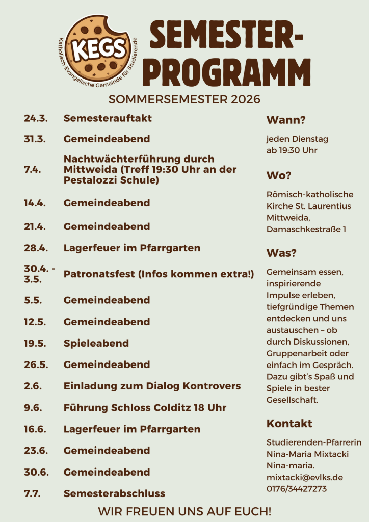 Gern kannst du dich auch bei unserer Pfarrerin melden. Unsere Themen für das Semester findest du auf dem Flyer.