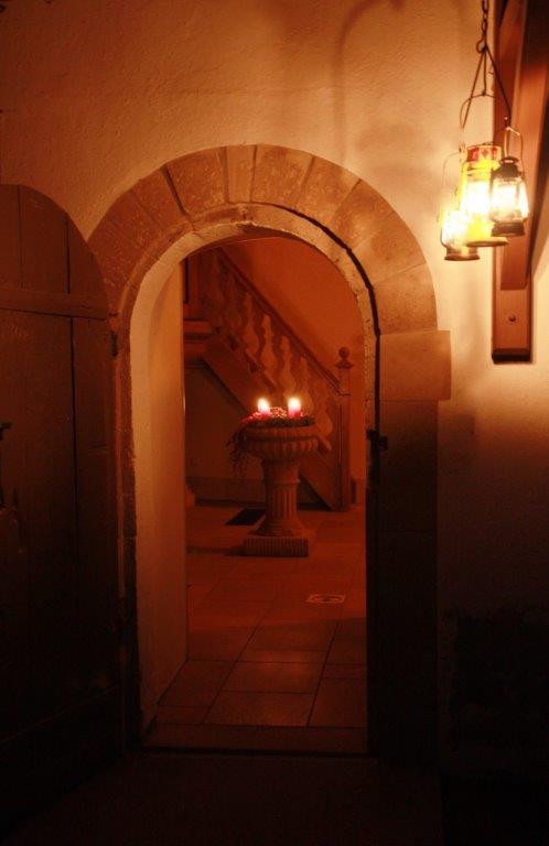 Später wurde dieser Raum durch Abbruch des Westgiebels erweitert ( heutiges Kirchenschiff mit Dachreiter).