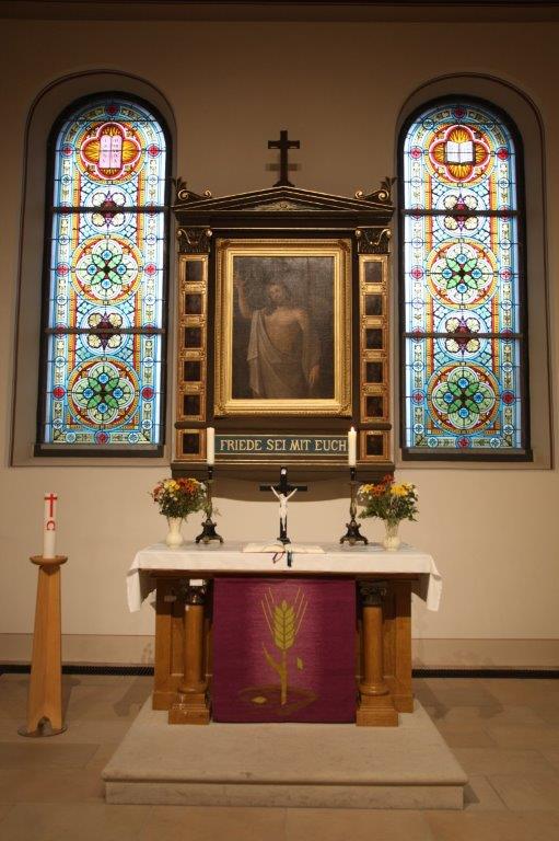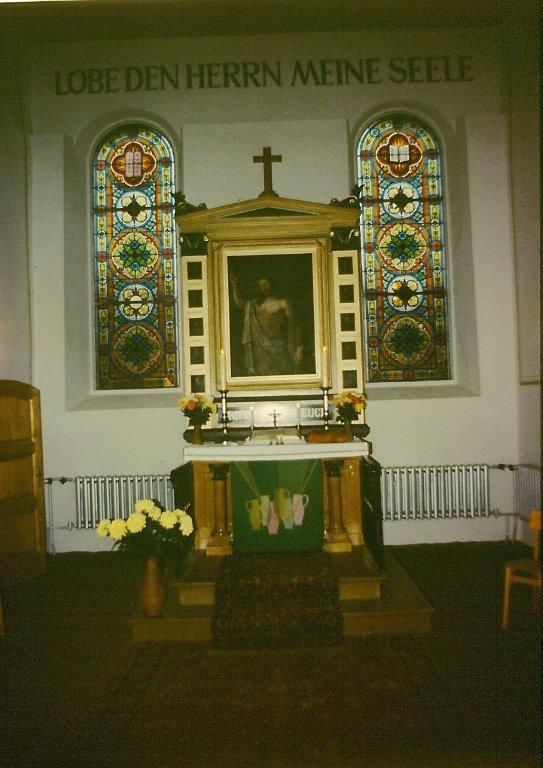 Das Altarbild, angeschafft 1877, zeigt in der Mitte den auferstandenen Christus (Öl auf Leinwand), umrahmt von 12 Apostelporträts (Öl auf Holz, wesentlich älter, wertvolle Arbeit unbekannter Herkunft).