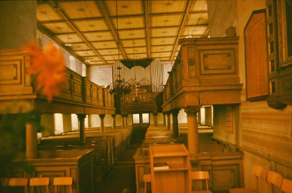 Um 1753 wurde der Dachstuhl über dem Altarraum neu aufgebaut. Durch Erhöhung der Außenmauern konnte die Decke über dem Altar der des größeren Kirchenraumes angepasst werden. Die Doppelempore der Nordseite wird erweitert.